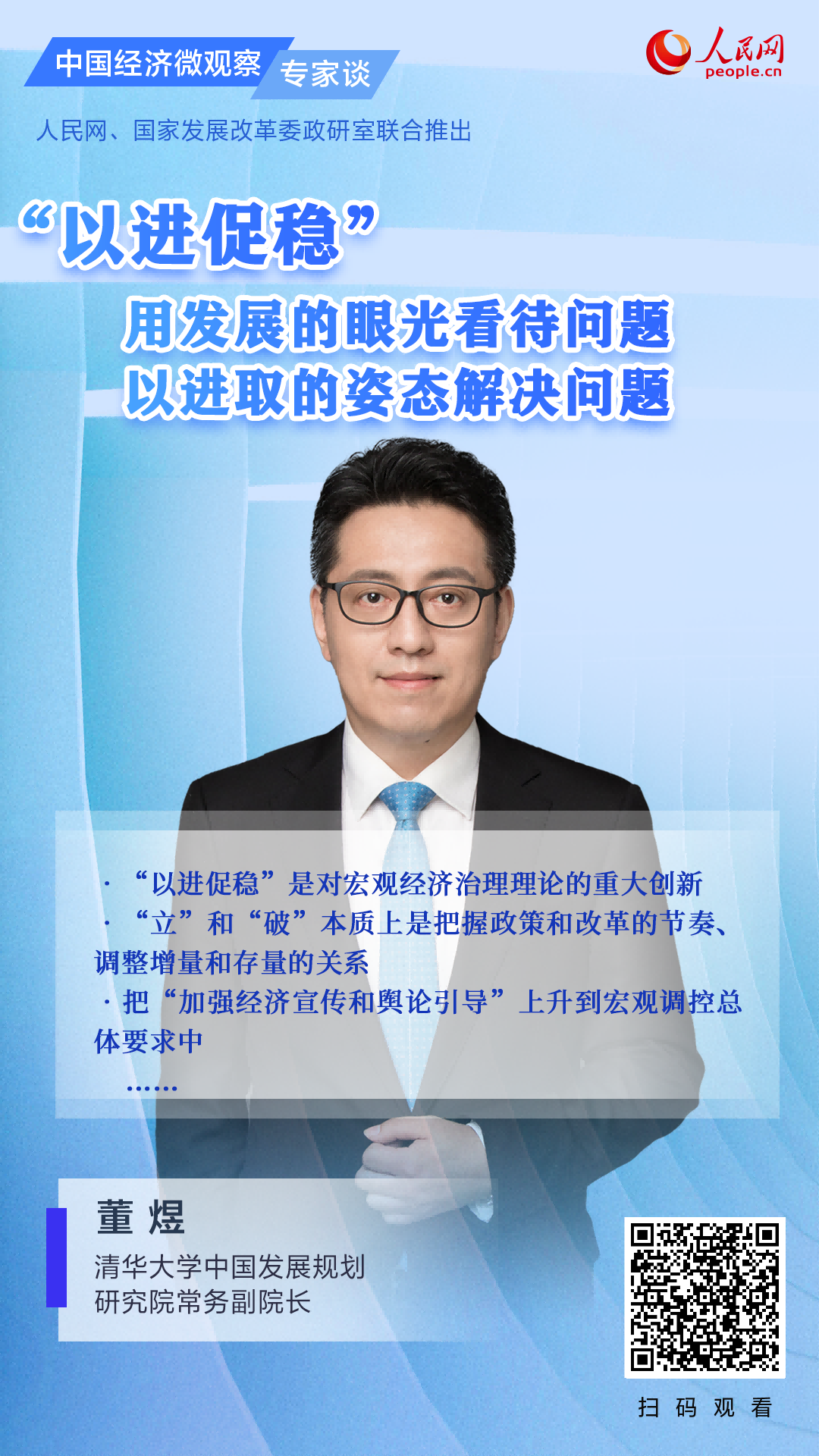日前,清华大学中国发展规划研究院常务副院长董煜做客《中国经济微观察·专家谈》栏目时表示,“以进促稳”是对宏观经济治理理论的重大创新,提出了进和稳之间基于动态平衡的更高水平要求。他认为这是一种新的稳定观,即以发展眼光看待问题,并以积极进取的姿态解决面临的安全和稳定问题。实现“以进促稳”的目标,要通过结构、质量、效益、改革的“进”来创造稳定发展的环境。